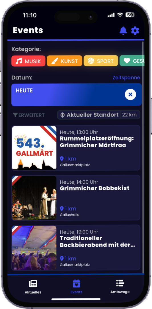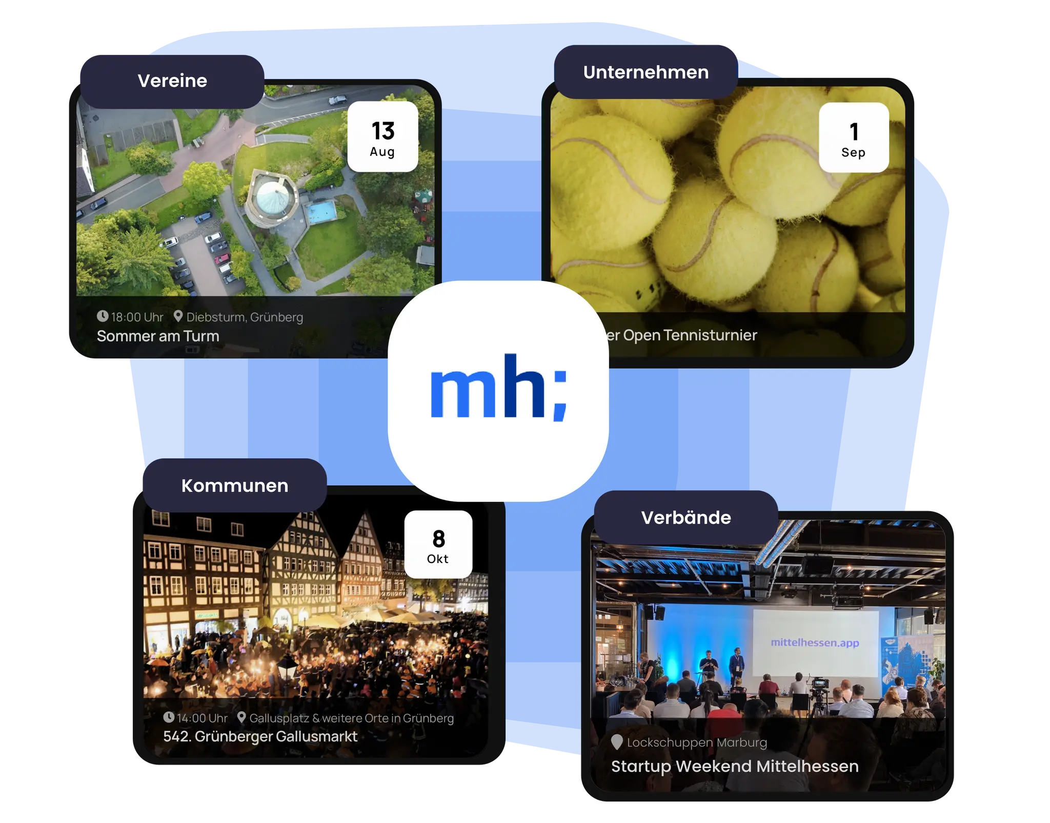 Egal wann und wo, bei uns ist immer etwas los. Mit über 5,000 Veranstaltungen bieten wir für jeden Geschmack das Richtige – sei es Markt, Party, Kirmes oder Umzug. Verpasse keine Highlights mehr und erlebe deine Heimat Mittelhessen in voller Vielfalt!
